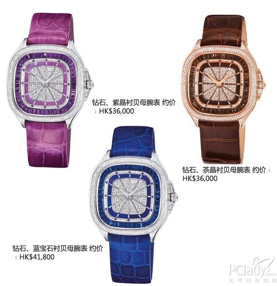 最新的Emphasis Timepiece腕表系列以方形圆角的TV shape为錶面设计,塑造怀旧优雅的轮廓。方形表框镶嵌耀眼的钻石及宝石,缀以贝母,营造深浅相间的视觉效果,明快俐落的线条型格,表现时代女性的率真个性。同系列有多个色彩鲜艳的pop colour选择,配搭型格retro打扮,摩登怀旧兼备。