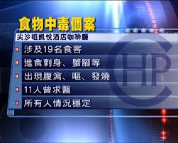 港卫生署卫生防护中心昨日调查一宗集体食物中毒个案。十九名男女上周五在尖沙咀凯悦酒店咖啡厅进食过刺身、冻蟹脚、青口等食物,其后陆续出现肠胃炎征状,包括腹泻、呕吐、恶心、腹痛和发烧。