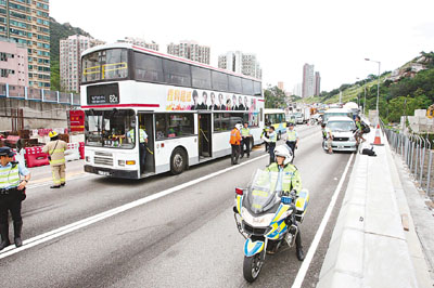 香港一辆接载内地游客离境的旅游巴士,6日晨驶经屯门公路时,疑刹车不及与前面一辆双层巴士相撞,酿成16人包括旅行团14名男女团员及2车司机受伤送院,幸各人伤势不算严重。