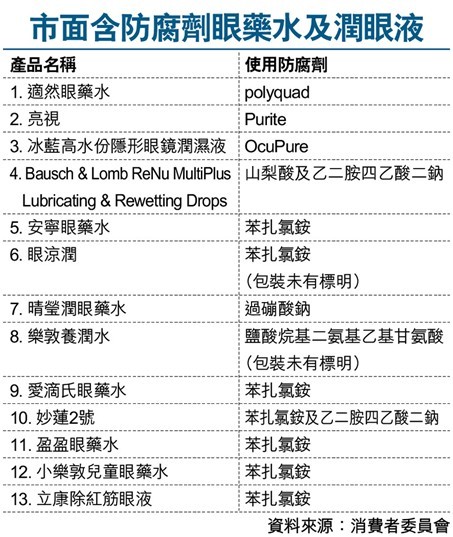 香港消委会搜集市面上16款眼药水的资料,发现13款含有防腐剂,其中2款没有标示防腐剂成分,部分眼药水含有类固醇。其中一名长者使用眼药水一段时间后,眼部感到不适,经医生诊断后,相信该名长者是过度使用含有类固醇的眼药水,令角膜变薄及眼内压升高,导致眼球爆裂。