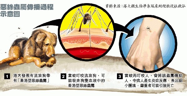 卫生防护中心发言人表示,恶丝虫是可感染多种哺乳类动物的寄生虫,狗隻属於其主要的寄生宿主之一,人类偶然可经蚊虫叮咬感染,而出现皮下、结膜肿块、蕁麻疹或淋巴炎等,但恶丝虫病并不会人传人,可透过手术切除肿块作治疗,市民如有类似病徵,应向医护人员求诊。中心会密切跟进,获得更多资料。