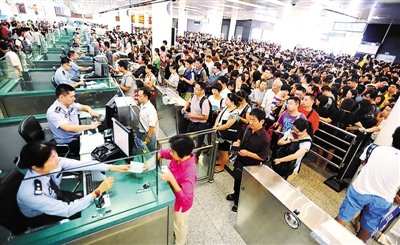 据皇岗边检站相关负责人介绍,连日来每天自早上7时许开始,皇岗、福田口岸出境大厅就人声鼎沸、摩肩接踵,络绎不绝的客流高峰一直居高不下,并持续至中午才趋缓。