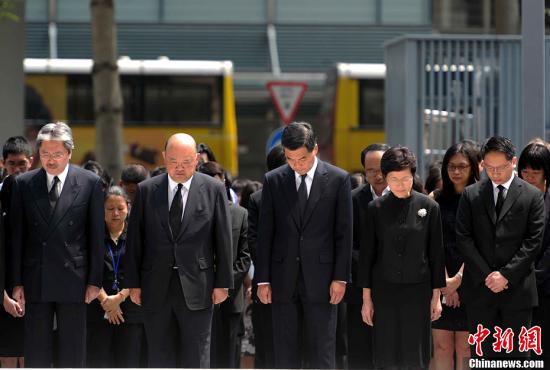临近中午,行政长官梁振英、终审法院首席法官马道立、政务司司长林郑月娥、财政司司长曾俊华、律政司司长袁国强等特区政府主要官员及部分行政会议成员步出政府大楼。此前已陆续有近二百名政府总部员工到广场肃立等候。