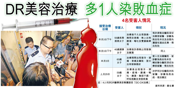香港一美容院发生败血性休克事件后,特区政府卫生署跟进调查后发现,先后有44人曾在这家“DR医学美容集团”接受DC-CIK治疗。卫生署发言人5日晚说,除了三名仍留院且情况危殆的病人外,再有一名女子因接受静脉输液后患上败血病。