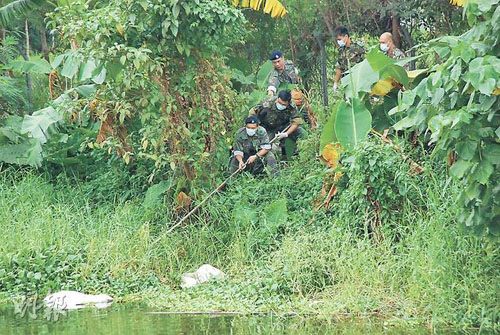 上水虎地坳村一池塘内有盛着24只冰鲜猪壳的尼龙袋载浮载沉,戴着口罩的警员18日与消防抵着恶臭,把猪壳逐一捞上岸。