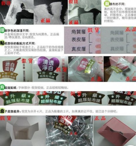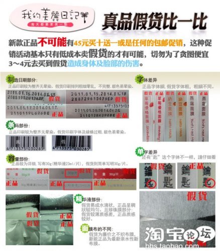 假货的精华液是水滴状的,刚拿出来的时侯甚至会在袋子底下积不少水。正品的精华液有粘性,清澈均匀不粘手。关于精华液的味道,这个真的很艰难,高仿之所以是高仿就在这里,我见过一种高仿,精华液的味道与正品的很相似,比如芦荟的就有淡淡的芦荟味道,樱花的就有樱花的味道。前几天看到有人买了100片1.98的美丽日记给女朋友用,用了30片后,居然感觉还挺好我不知道她是怎么感觉的,我也没做过化验,我想是因为高仿的精华液中添加了某些的成分,比如说香精、化学添加剂、漂白剂...算是我还是不说了,吓人~总之说一千道一万,大家一定要提高警惕,假货的质地和效果肯定无法与正品相比,虽然你用的时候没什么不对,甚至当时还有些效果,但对皮肤可能造成的隐性伤害是无法估计的,我们不想拿自己的脸蛋做赌注,因为我们是貌美如花、成鱼落雁的XX(帮忙想个词有奖),代表着某办公室,某寝室,某个窗口,某家店面,某个公司,某位老公的美好形象,是神圣而伤不起的。