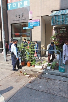 花店门外两个盆栽遭堕楼小狗压毁。