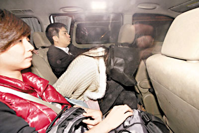 其中一名被捕女疑犯以黑布蒙头带署扣查。