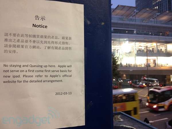 不过尽管现场布满了告示,他们显然还是没有准备放弃,依然不肯散去。没在网路上订到新iPad,准备去现场提货的香港朋友就祝你们成功,因为Apple 的香港网站星期四必定会变得水泄不通的。