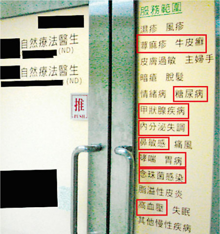 位于佐敦的营魄自然疗法医疗中心,玻璃大门外清楚列明“服务范围”包括哮喘、糖尿病、高血压等(红框示),但根据《不良广告(医药)条例》,任何人不得发布广告宣称治疗或预防这类疾病
