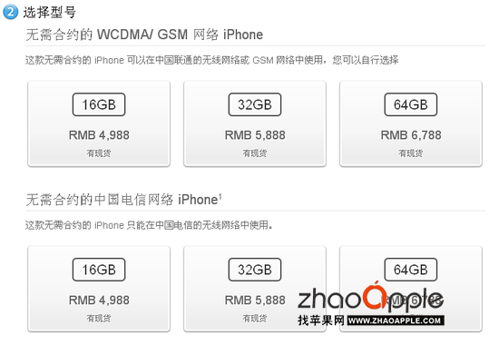 苹果官网已悄然出售电信版iPhone 4S裸机,售价与联通版一样,起步价都是4988元,目前信息显示货源充足,且不限购买数量,北京的消费者大约两三天就能收到货。记者昨日登录苹果在线商店发现,iPhone 4S型号已经增加了“无需合约的中国电信网络iPhone”,显示只能在中国电信网络中使用。其价 格与联通版相同,16GB版本4988元、32GB版本5888元以及64GB版本6788元。此前中国电信的渠道里只销售合约机。