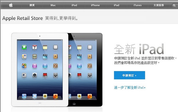 香港苹果官方网页(香港苹果官网)昨公布,明日再次接受市民预订新iPad。小编昨日以顾客身份致电苹果查询,职员称新一轮预订与上周四的首轮预订不同,首轮预订每人最多可订购两部新iPad,并实时以信用卡付款,约于3月16日至3月26日期间取货;但新一轮预订则只需登记个人资料,成功预订者当晚会收到确认电邮,翌日再到香港中环苹果专卖店付款取机。