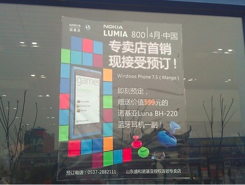 从诺基亚授权专卖店放出的预订广告来看,诺基亚Lumia 800将在4月正式上市,并且将搭载Windows Phone 7.5系统,而并非最新的Tango系统。此外,该机售价方面还是没有透露,据以前的猜测,诺基亚Lumia 800售价将在4000元以内。