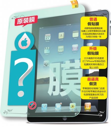 普通假贴膜:成都电脑城里摆起卖。贴膜上没有苹果商标和主题,仿造品质较高的A货成本为8到10元钱一张。最逼真假货:苹果授权经销商门店卖。不仅印有苹果的烫金标识,包装背面是全英文的产品说明