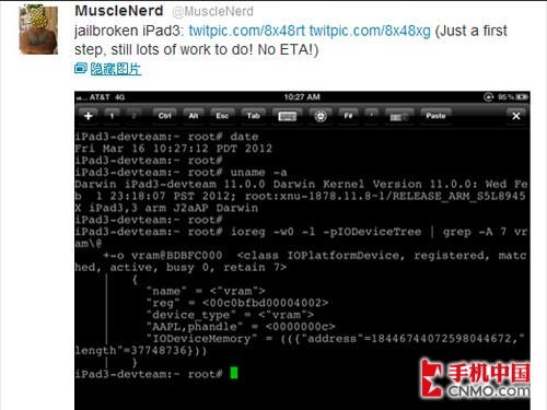 著名黑客MuscleNerd(肌肉男)在其Twitter上发表推文,表示自己已经将刚购买的新iPad完美越狱,并且放出了新iPad完美越狱的截图,随后首先越狱A5 CPU iOS 5.1的i0nic给予了确认,并表示自己也已经获得了完美越狱,i0nic没有第一时间完美越狱的原因并不是没有找到新iPad的越狱方法,而是没有第一时间拿到新iPad。至此,iOS 5.1上的全部设备都已经获得了越狱。