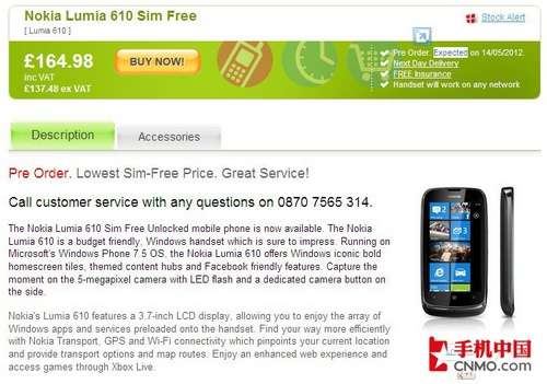 在英国Unlocked-mobiles网上商城,诺基亚Lumia 610目前已经上线预售,欲抢先体验的消费者可在该网上商城进行预订,其售价为165英镑,约合人民币1660元。另外,Unlocked-mobiles页面信息显示,诺基亚Lumia 610将于今年5月14日正式发售。