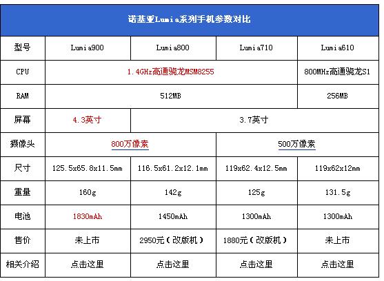 从表格中,我们可以看出,定位于中高端智能手机领域的Lumia900、Lumia800以及Lumia710在处理器、RAM等事关运算性能的部件具有相同的配置,性能比较接近。而Lumia610定位相对较低,处理器不给力,RAM缩水,性能偏低。四款机型的屏幕分辨率都维持在800x480像素,显示水准和720P高清手机有比较大的差距。从摄像头上的配置水平来看,Lumia800、Lumia900均配备了卡尔蔡司认证的800万像素摄像头,实际拍摄效果好于配备普通500万像素摄像头的Lumia710和Lumia610。