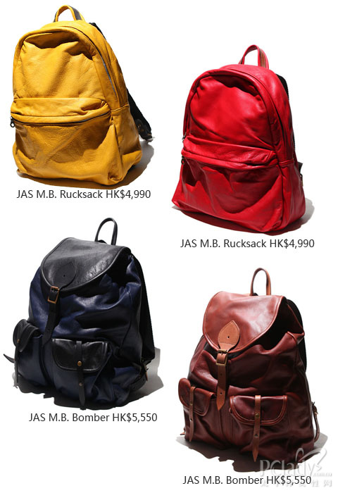 JAS M.B.本季继续以柔软如 used 的牛皮,制作经典背包,无袋盖的 rucksack 外形平平,但上了鲜黄色的皮革,比起其他物料更加眩目。而另一 bomber 款则以 classic 挂帅,前方两小物袋相当 user friendly ,爱旅行漫游人士适用。