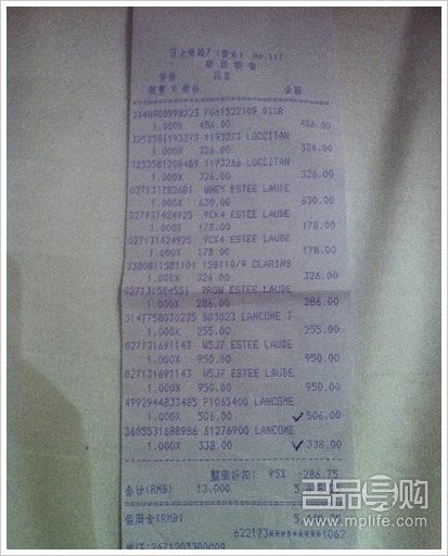欧舒丹6支装 326,娇韵诗抚纹霜326(防妊娠纹的,我好未雨绸缪 ),兰蔻蓝水255,雅诗兰黛ANR眼霜双瓶装630,ANR面部精华100ML大瓶装950,给妈妈婆婆各带一瓶,红石榴洗面奶178,最后两只被我收入囊中,后面一个MM直接说要这个,售货员说没货了。。。其实回程的提货点旁边那个日上店都有货的,我回浦东的时候又补了一堆雅诗兰黛,JM们可以放心补货哦!用了打折券还可以再打95折,超划算!!比香港便宜丫。。兰蔻的大瓶粉水到处断货,后来我在连卡佛的专柜买的,370港币。