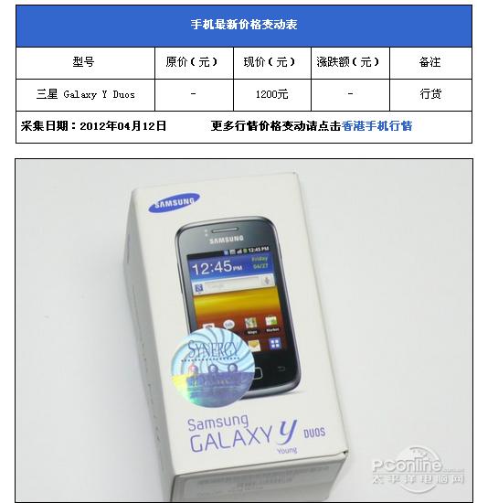 [参考价格]:三星 Galaxy Y Duos HK$1480 (折合人民币1200元,香港行货)