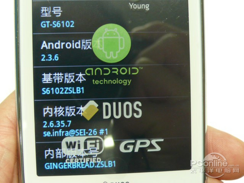 S6102 Galaxy Y Duo 小归小,电池倒是挺够力的!有 1300 mAh 的大肚量喔!S6102 Galaxy Y Duo 的秘密武器 Dual SIM!可以放两个不同号码(废话)左上方为内存卡插槽,最大支持 32 GB!S6102 Galaxy Y Duo 拿起来是这个样子的,质感还不错!搭载 Android 2.3 操作系统!