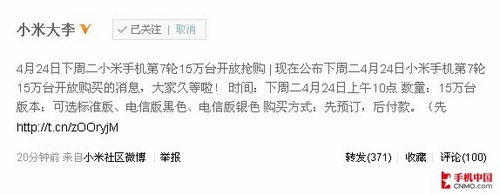 小米手机论坛社区负责人小米大李日前发布微博表示,小米手机第7轮开放购买将于4月24日(即下周二)上午十点开始,本轮共发售15万台,其中包括小米手机标准版,以及黑色和白色的小米手机电信版。