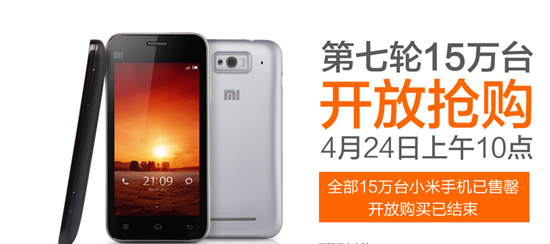 4月24日,小米官网启动小米手机第七轮15万台开放预订活动,相比前一轮开放购买发售数量增加了50%。此轮开放预订仅20分钟,15万台小米手机已全部售罄。