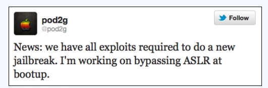 Pod2g上周表示Chronic dev team已经找到了iOS 5.1完美越狱所需的所有userland级别的漏洞,前些天他还表示已经绕过了ASLR,这些都表明了iOS 5.1完美越狱实现的可能性,只不过越狱工具放出仍需时日。