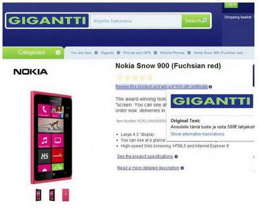 过去一直传言会有诺基亚Lumia900粉色版本推出,甚至在日前还得到了官方的证实,但具体的推出时间和指定上市地区却没有准确的消息。不过,来自芬兰零售商Gigantti的消息显示,诺基亚Lumia900品红版本已经开始预售,并且会在五月份到货。