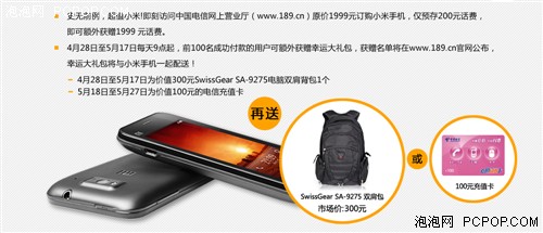 4月28日至5月17日,每天9点起,前100名成功支付的用户可以在获得1999元话费返还的同时获得幸运大礼包,包括一个SwissGear双肩包以及一张100元充值卡。