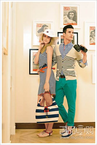 On Karolina:蓝白条纹背心连身裙($1,190)、红色H字扣皮带($690)、白色圆帽($330)、蓝白色横纹航海风手袋($790)、红白蓝T-strap凉鞋($990);On Renato:缀以刺绣徽章的蓝色格子恤衫($990)、蓝间米色外套($1,490)、腰带($430)、绿色斜纹棉布裤($990)