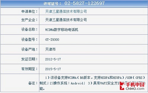 WCDMA版GALAXY S III(GT-I9300)获得入网许可