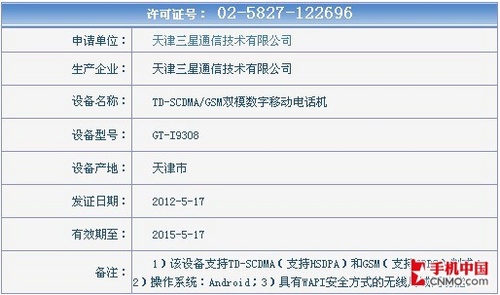 移动TD版GALAXY S III(GT-I9308)获得入网许可