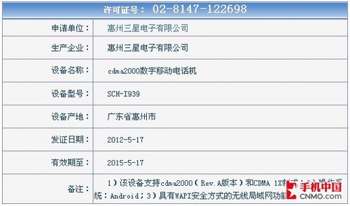 电信CDMA版GALAXY S III(SCH-I939)获得入网许可