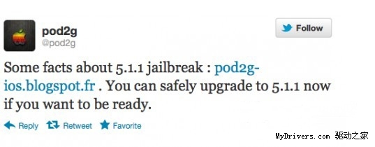 当然了,Pod2g则在Twitter表示,用户可以将自己的设备更新至iOS 5.1.1了,而这也预示这他将很快发布完美越狱工具。不过解锁设备的用户需要保存基带,而更新系统前请做好备份。