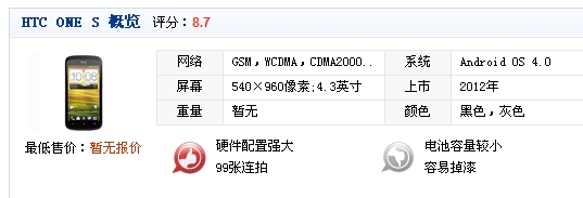 硬件配置方面,HTC One S的表现十分抢眼。它采用一颗主频为1.5GHz骁龙S4双核处理器,并辅以1GB的高容量运行内存,有效的保证了该机的流畅运行。系统方面,它搭载时下最新的Android 4.0操作平台,配以HTC Sense 4.0的界面,整机体验效果非常好。值得一提的是,该机内置有16GB的大容量存储,可以满足用户对手机存储方面的需求。