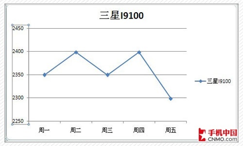 三星I9100可以说是双核Android智能机的代表了。它拥有时尚纤薄的机身,1.2GHz的猎户座双核处理器也保证了它流畅的运行体验。价格方面也是经过时间的推移越来越实惠。下面就是三星I9100本周的价格走势图,从上图我们可以发现,在周二和周三的它价格出现了上涨趋势,之后的周四就急速下跌,截止到周五已降至2299元。