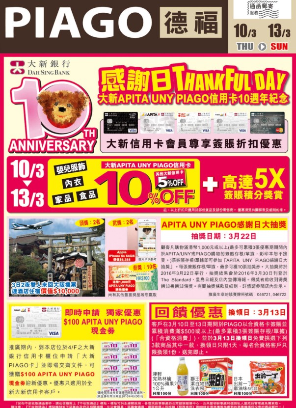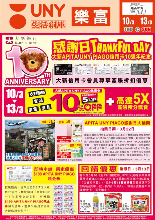 香港打折:UNY生活创库、PIAGO德褔最新购物优惠(16年3月10至13日)