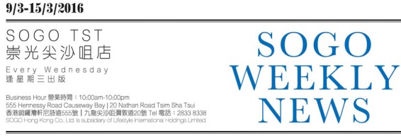 香港打折:sogo崇光百货铜锣湾店本周最新购物优惠(16年3月9日至3月15日)