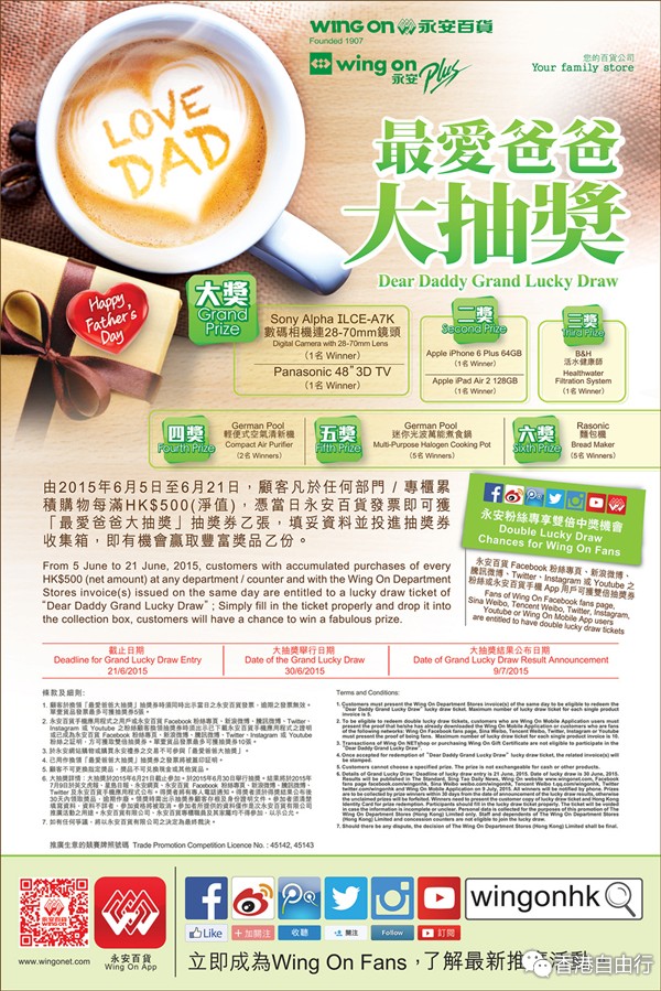 香港优惠:“父亲节”永安百货最爱爸爸大抽奖活动(至2015年6月21日)